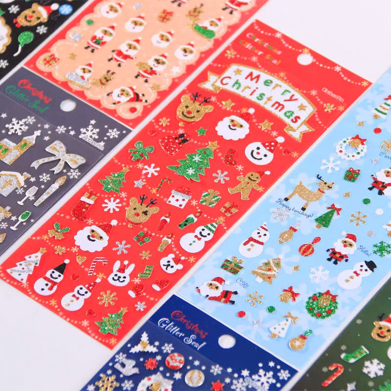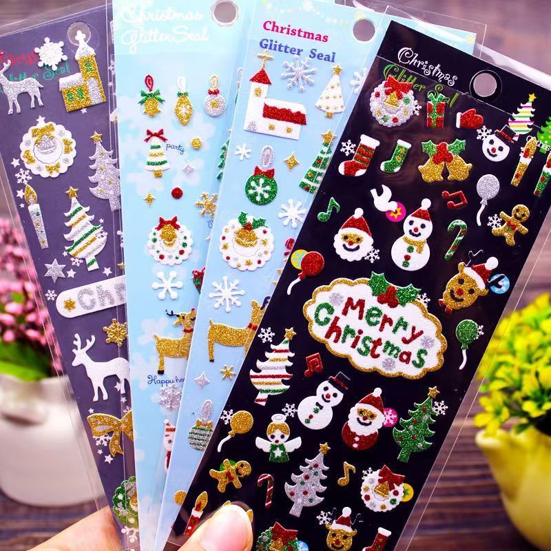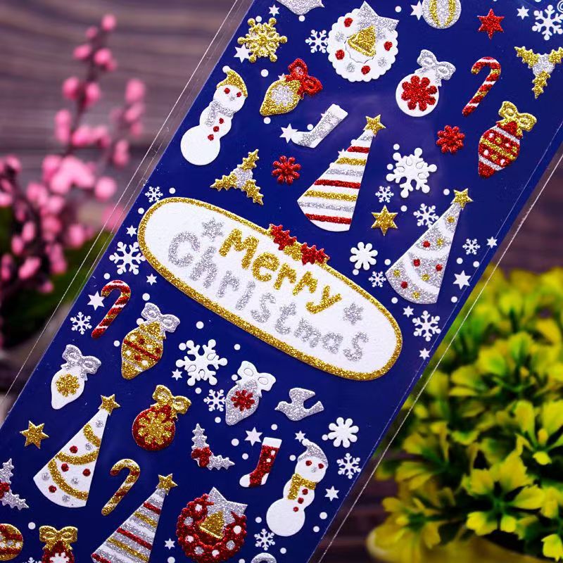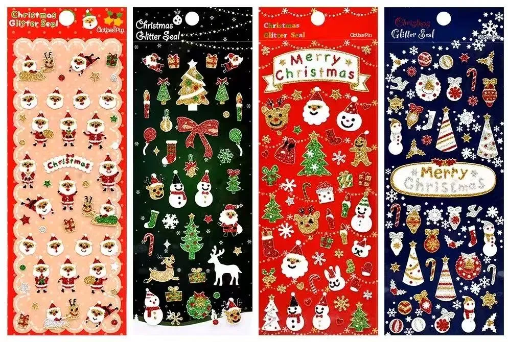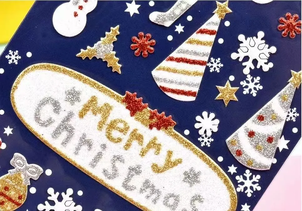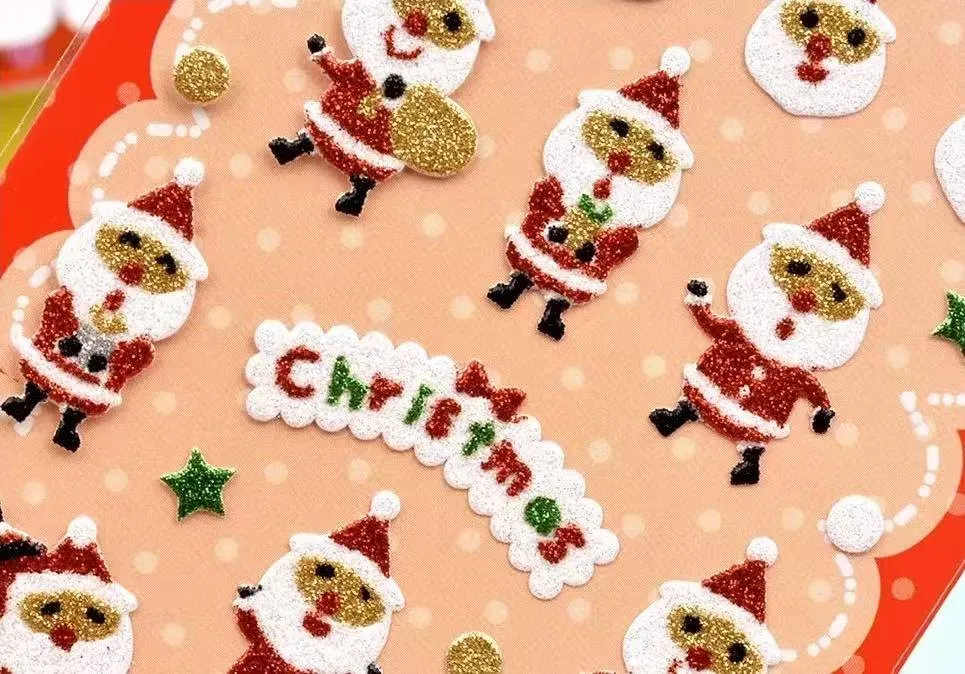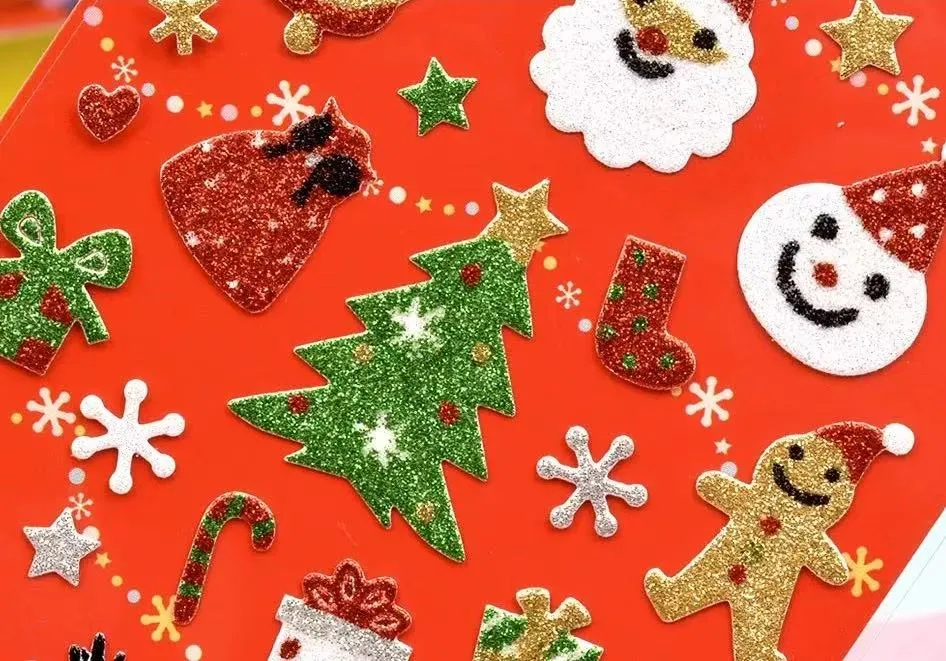 Kalėdiniai blizgučių lipdukai gali pasiekti puikų sukibimą ant įvairių sklandžių paviršių, tokių kaip plastikas, stiklas, metalas ir popierius.