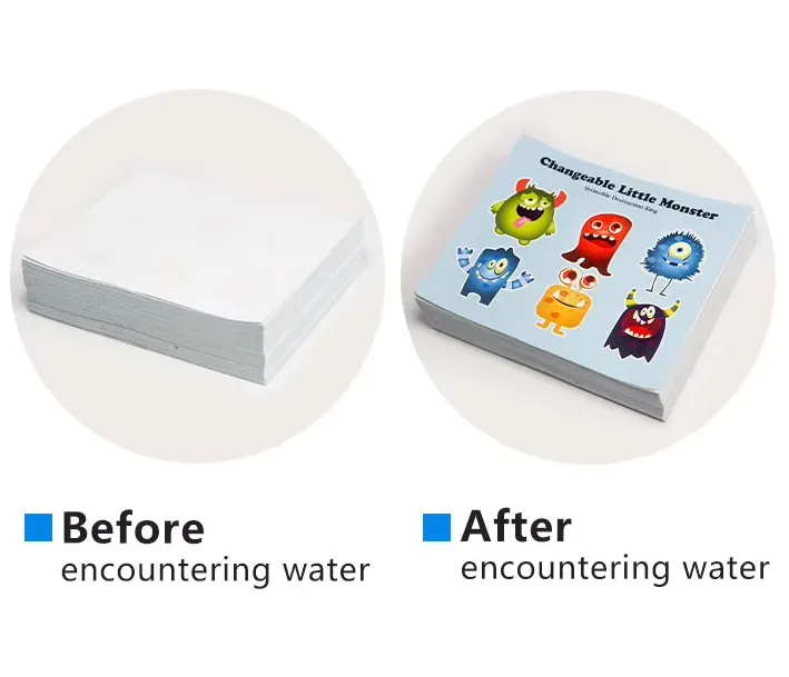 Pakanka tik nedidelio vandens purslų, kad suaktyvintumėte etiketės atsaką. Lengvos ir nešiojamos, etiketės gali būti įvairių formų, pavyzdžiui, atvirukų ir momentinių nuotraukų stiliaus spaudinių.JOJO pakuotėteikia pritaikymo paslaugas, galime ant etikečių atspausdinti animacinių filmų raštus, prekės ženklų logotipus, reklaminį turinį ir kt. Jie idealiai tinka šventiniams sveikinimo atvirukams, vaikų mokomiesiems žaislams, prekės ženklo rinkodarai, kovai su padirbinėjimu ir kitoms reikmėms.