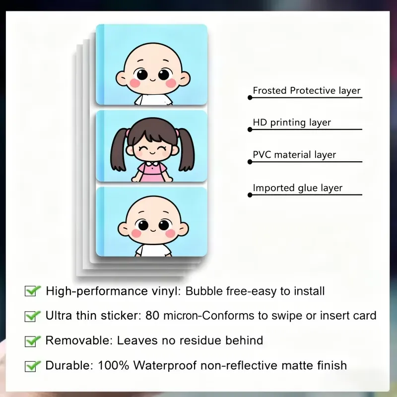 Kreditinės kortelės viršelio lipdukaiyra dekoratyviniai ir apsauginiai lipdukai, skirti klijuoti ant kredito kortelių paviršiaus. Jie taip pat tinka kitoms panašaus dydžio kortelėms, tokioms kaip debeto kortelės, transportavimo kortelės ir raktų kortelės.