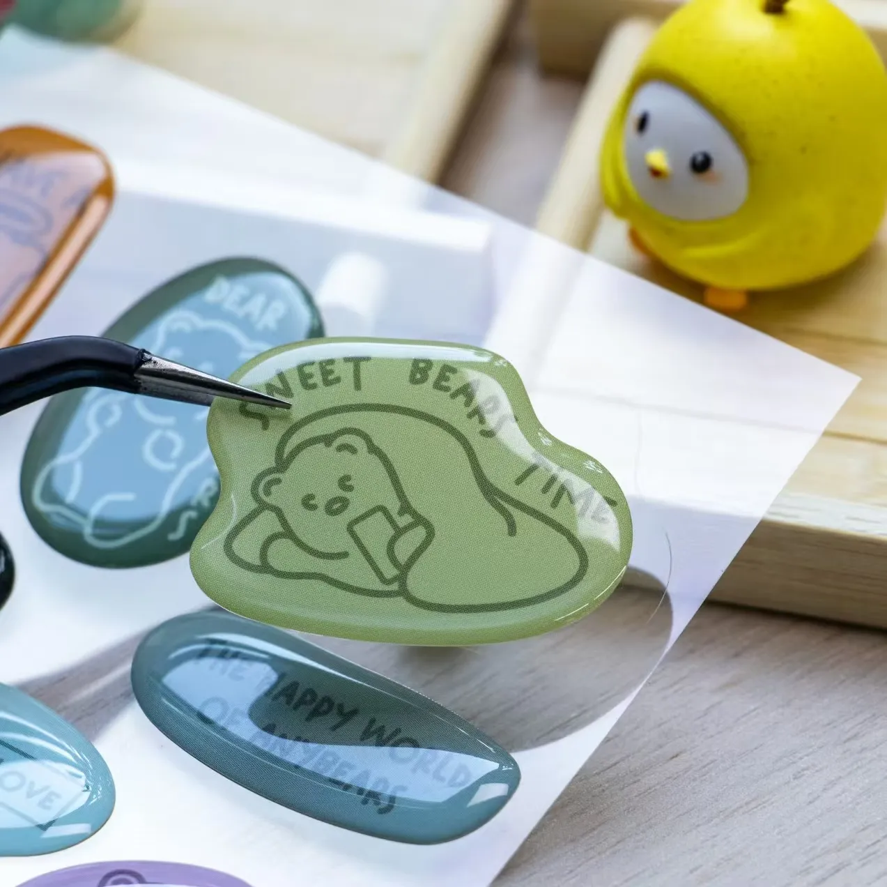 A1: Naudojame aukščiausios kokybės žaliavas: patvarius lipnius pagrindus (vinilą, PET arba popierių), ekologišką rašalą didelės raiškos spausdinimui ir pramoninės klasės epoksidinę dervą. Derva užtikrina, kad 3D kupolo formos lipdukai būtų atsparūs įbrėžimams ir ilgai išlieka blizgūs.