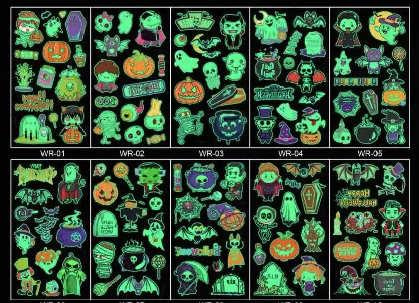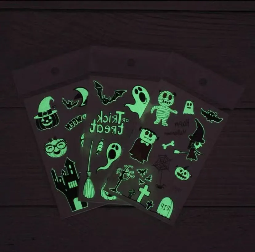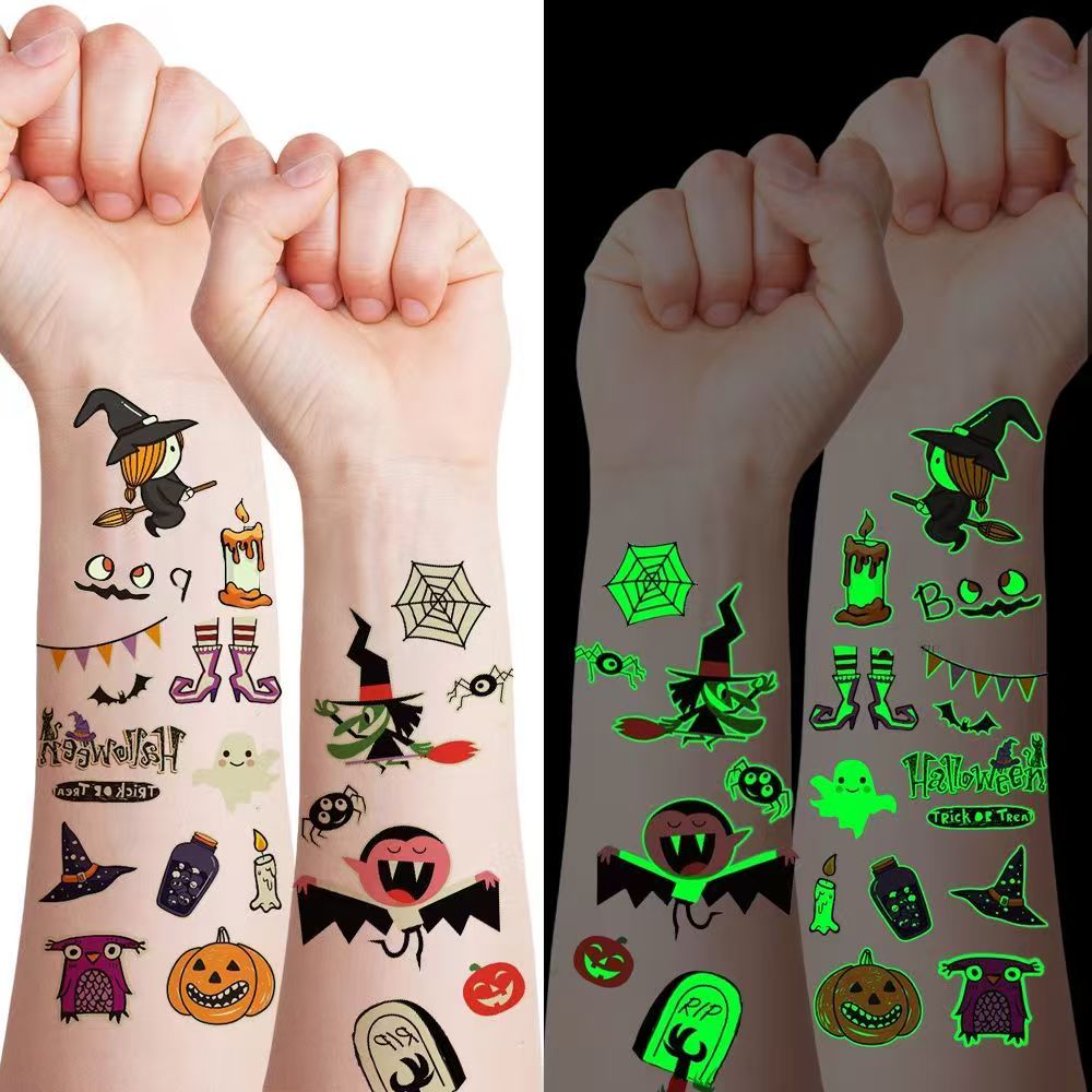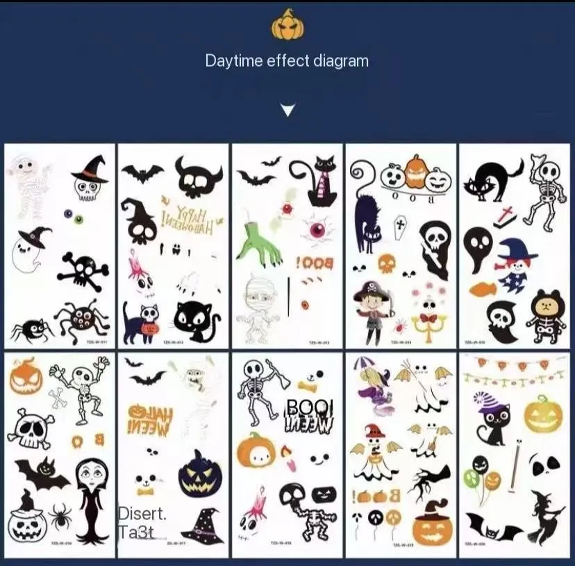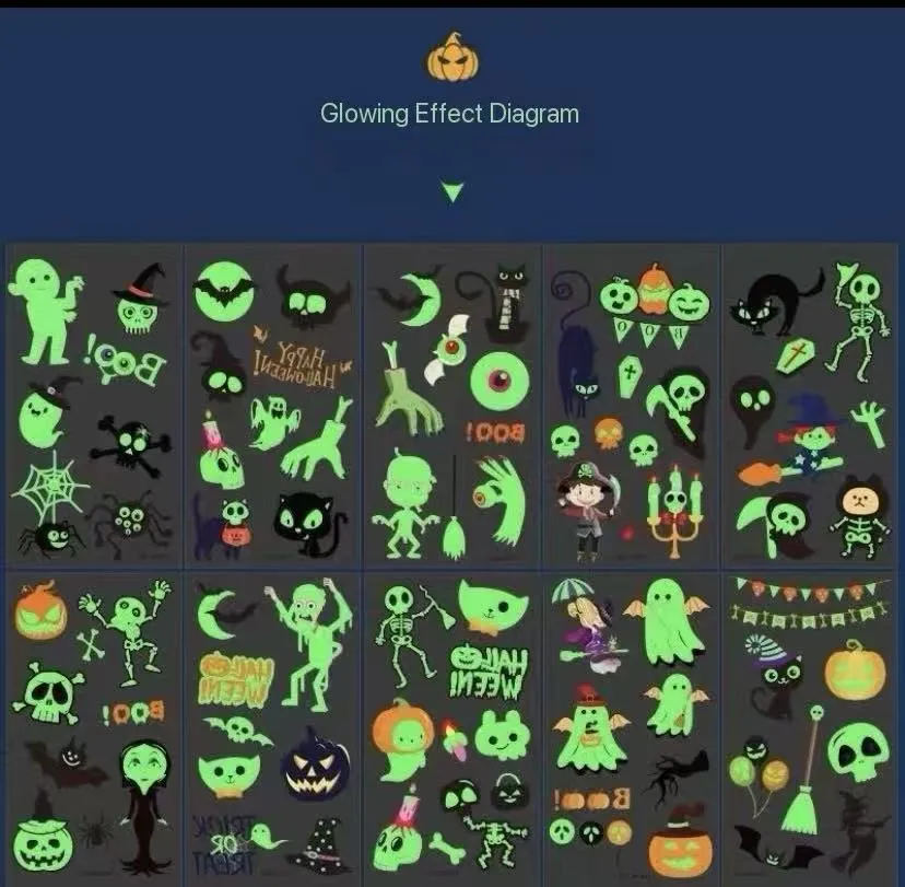 „Halloween Night Glow“ tatuiruočių lipdukai yra kūrybinga dekoratyvinė prekė, specialiai sukurta Helovino šventei. Jis pagamintas iš ekologiškos „Glow-in-T-Dark“ rašalo medžiagos ir sujungia madingus tatuiruočių modelio dizainus. Dienos metu jis gali sukelti natūralų spalvų ar juodos spalvos tatuiruočių efektą, o naktį jis gali skleisti vėsią fluorescencinę šviesą, leisdama jums lengvai tapti dėmesio centru Helovyno vakarėliuose, gatvių paraduose ir teminiais renginiais. Nesvarbu, ar ieškote baisaus ir keisto vaiduoklių panašaus dizaino, ar norite, kad paslaptinga ir romantiška tamsi atmosfera, galite rasti savo mėgstamą variantą tarp turtingų modelių. Galite mėgautis akį traukiančia Helovyno tematikos apranga, neišnaudodami tatuiruočių skausmo ir pastovumo.