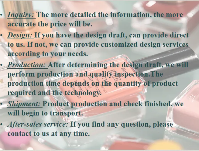 Turėdama turtingą patirtį ir pažangias technologijas, „Jojo Pack“ gamina pritaikytas nagų lako etiketes, kurias mėgsta klientai. Taip yra ne tik todėl, kad mūsų produktai yra aukštos kokybės ir žemos kainos, bet ir todėl, kad teikiame intymias paslaugas, tokias kaip pritaikytos paslaugos, konsultavimo paslaugos ir garantinio pardavimo paslaugos. Jei jus taip pat domina mūsų produktai. Prašau susisiekti su mumis.