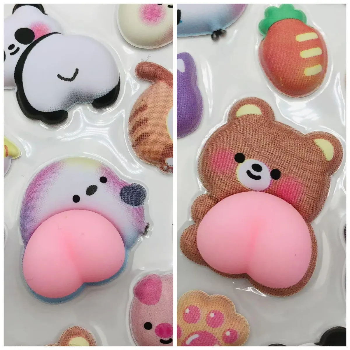 Skirtingai nuo tradicinių streso žaislų, šių užpakalio formos stresą mažinančių lipdukų nugarėlėje yra lipdukų, todėl juos galima klijuoti ir pakartotinai naudoti kaip įprastus lipdukus. Juos galima pritvirtinti prie telefonų, kompiuterių, užrašų knygelių, vandens butelių, rašomųjų stalų ar bet kokio paviršiaus, kurį norite papuošti, ir tarnauja kaip stresą mažinantis žaislas ir unikali asmenybės išraiška.
