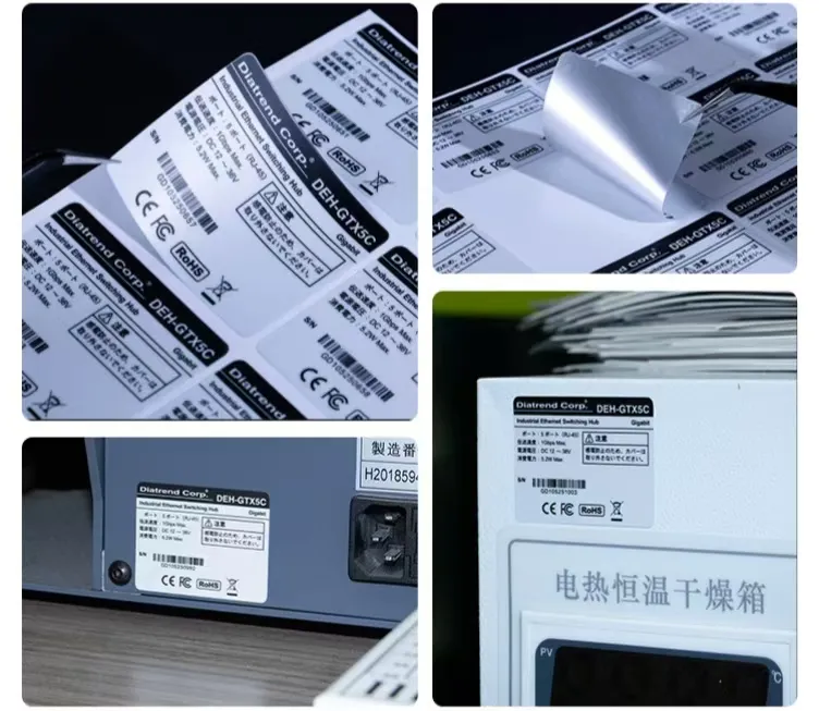 PET baltas/matinis sidabras: Atsparus karščiui iki 150 ℃, tinka buitinės technikos ir maitinimo adapterių vardinėms lentelėms.