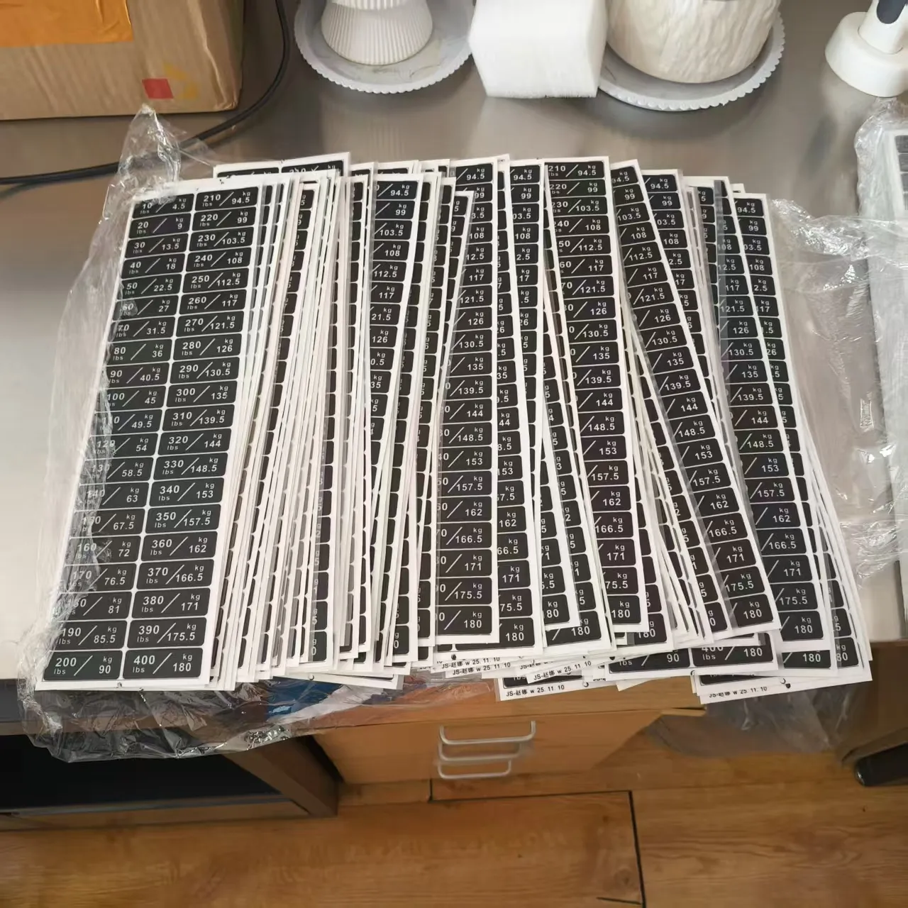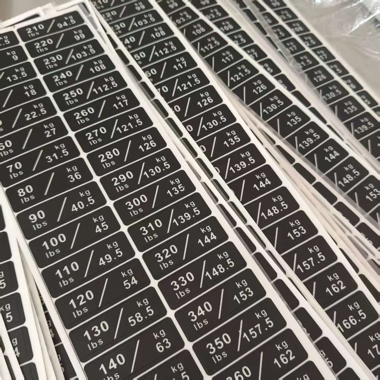 Fitneso įrangos svorių plokštelių lipdukai yra specializuotos lipnios etiketės, skirtos jėgos treniruoklių svorio plokštelėms. Pagrindinė jų funkcija yra aiškiai pažymėti svorio reikšmes, tokias kaip 5 kg ir 10 kg, padedant vartotojams greitai nustatyti svorius ir tiksliai sureguliuoti treniruočių pasipriešinimą. Jie plačiai naudojami tiek komercinėse sporto salėse, tiek namų jėgos įrangoje.