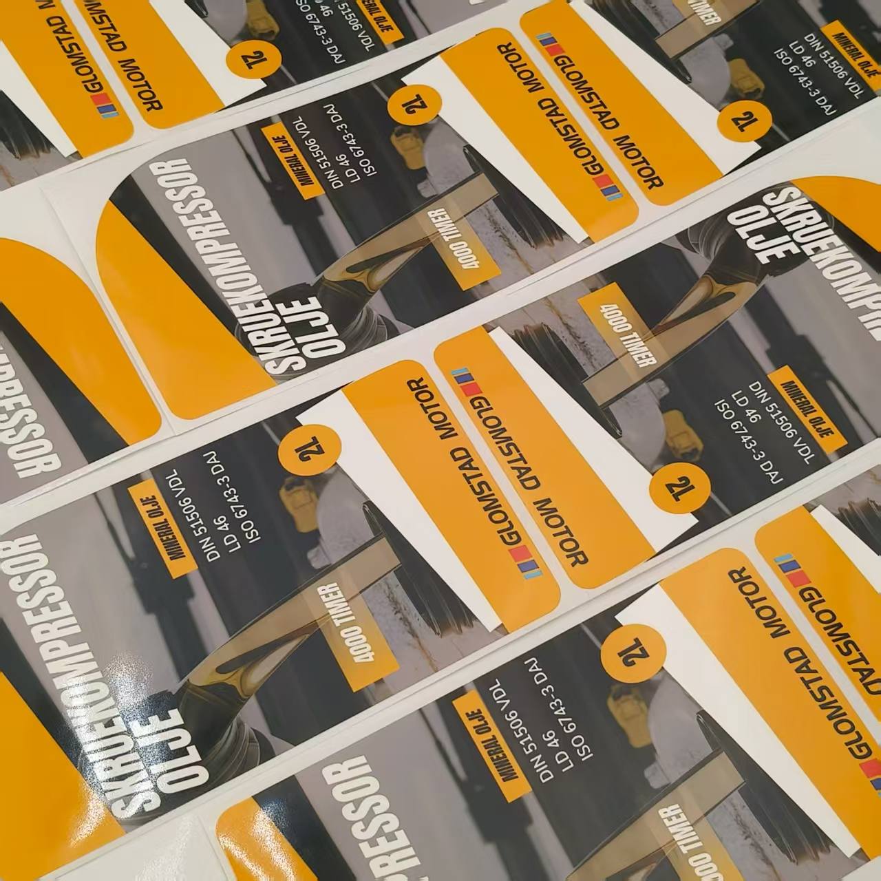 Pramoninė įranga: Variklinės alyvos produktai, naudojami įrangoje, kuriai reikalingas alyvos tepimas, pavyzdžiui, generatoriuose, kompresoriuose ir įvairiose pramonės mašinose, taip pat tinka mūsų variklinės alyvos etiketėms. Tai užtikrina, kad sudėtingose darbo aplinkose pramoniniai įrenginiai taip pat gali gauti tikslią informaciją apie alyvą per etiketes, užtikrinant stabilų įrangos veikimą ir sumažinant gedimų atsiradimą.