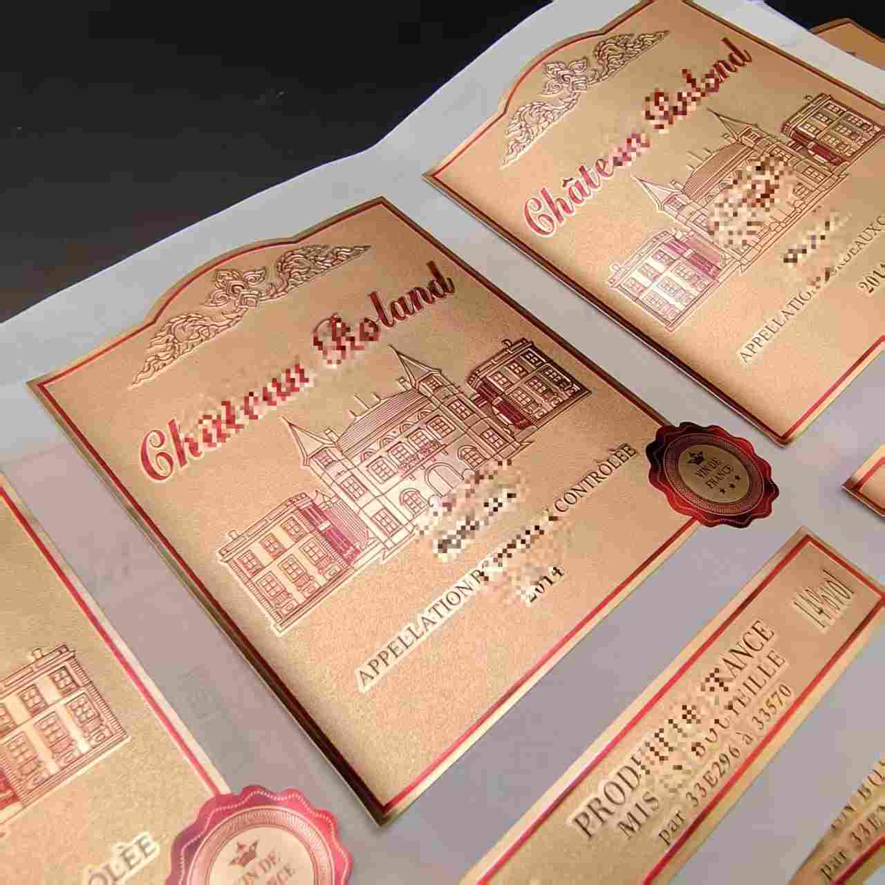 Vyno butelių lipdukai pagaminti iš aukštos kokybės PVC medžiagos, pagal užsakymą pagamintos PVC vandeniui atsparios paauksuotos vyno etiketės pasižymi puikiu atsparumu vandeniui ir drėgmei.